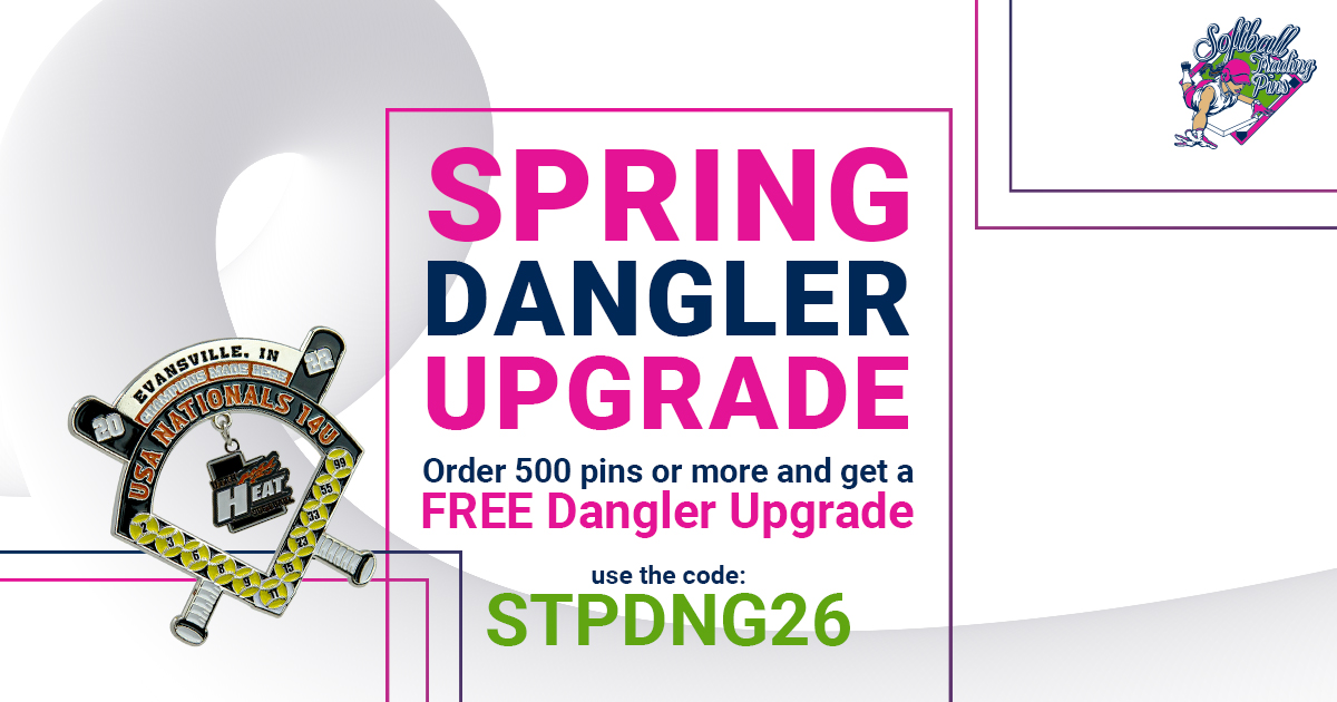 Order 500 or more custom softball pins for your team this March and score a FREE dangler upgrade. Make your team's custom design pop! Use code STPDNG26 at checkout. Offer valid March 1-31, 2026.